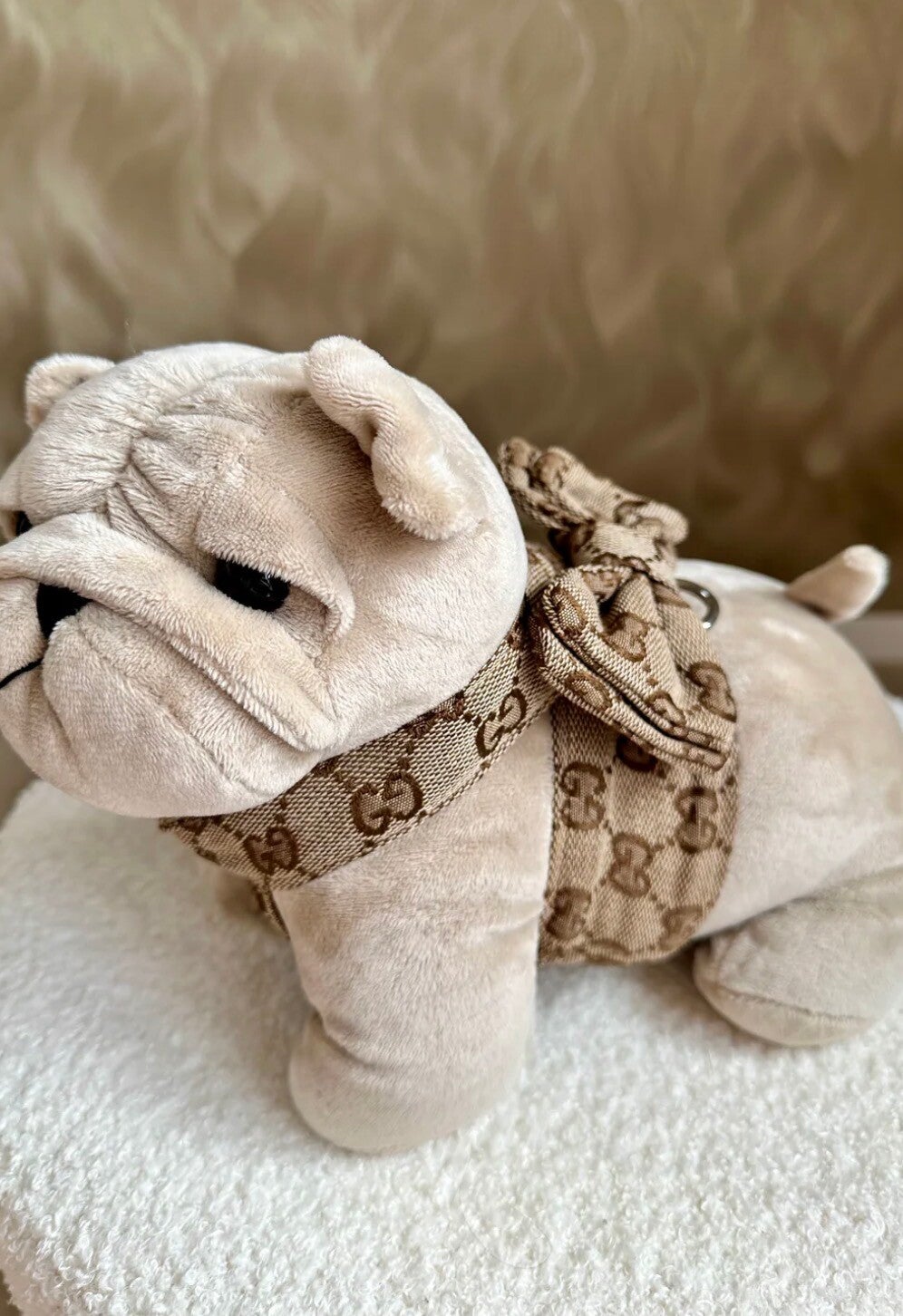 Dit GG print hondentuig in roze is een echte blikvanger. De iconische all-over print gecombineerd met de roze kleur geeft het tuig een luxe en elegante uitstraling, perfect voor honden die gezien mogen worden.
