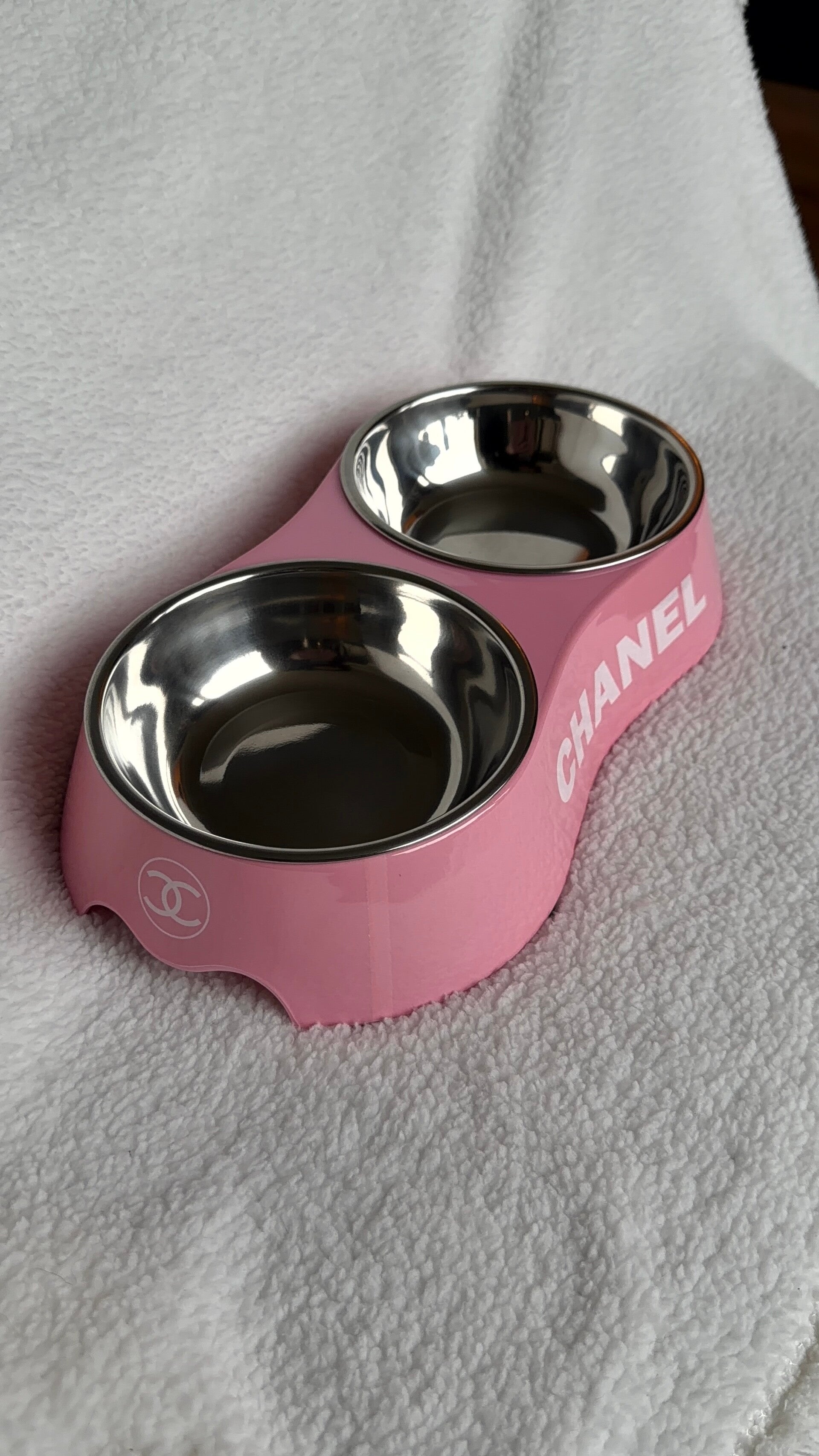 Deze Chanel dubbele voerbak in roze is ideaal voor zowel voer als water. De set bestaat uit twee bakken in één houder, zodat alles netjes bij elkaar staat.