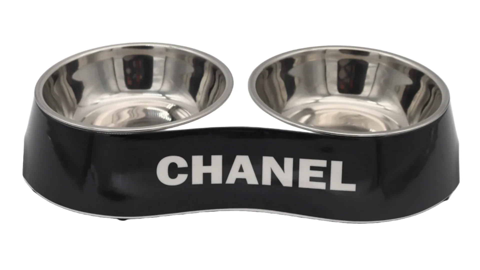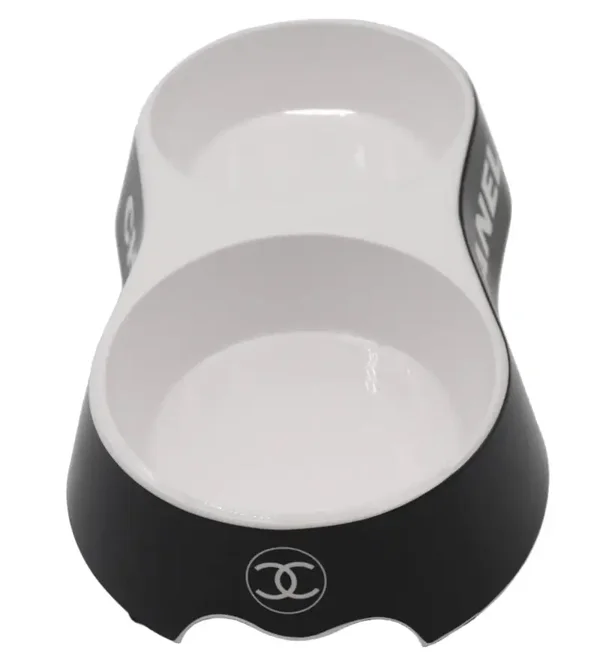 Deze Chanel dubbele voerbak in het zwart is ideaal voor zowel voer als water. De set bestaat uit twee bakken in één houder, zodat alles netjes bij elkaar staat.