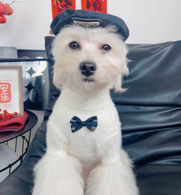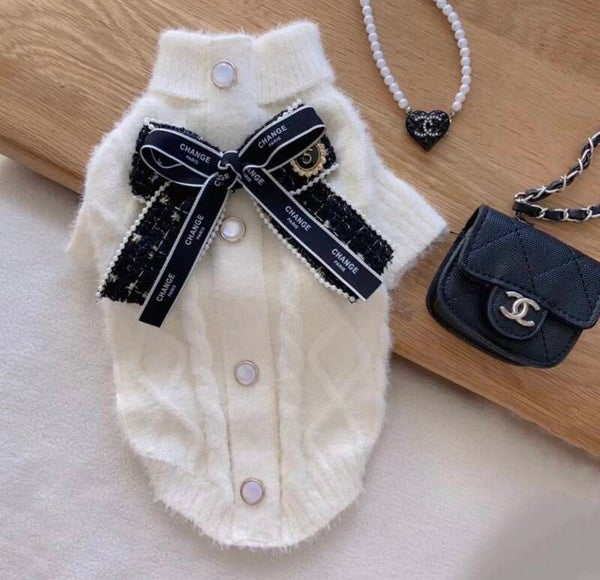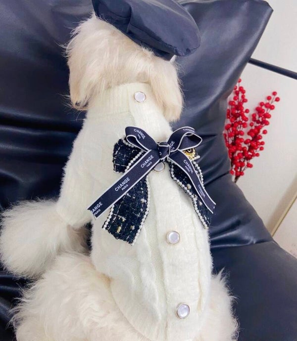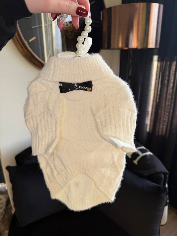 Een exclusieve trui met een verfijnde, luxe uitstraling. De zachte knit voelt comfortabel aan en wordt versterkt door elegante details zoals de contrasterende strik en stijlvolle afwerking. Een echte eyecatcher voor honden die gezien mógen worden.