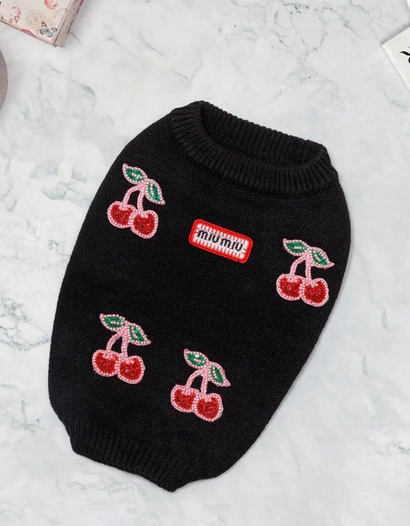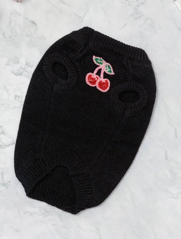 Een stijlvolle zwarte trui met verfijnde kersen-details voor een speelse maar luxe uitstraling. De zachte knit zit comfortabel en geeft je hond een elegante look met een modieuze twist. Perfect voor dagelijks gebruik, zowel binnen als buiten.