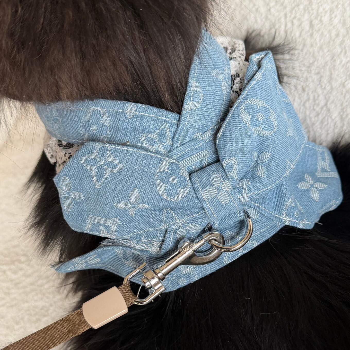 Dit print hondentuig in blauw is een echte blikvanger. De iconische all-over print gecombineerd met de roze kleur geeft het tuig een luxe en elegante uitstraling, perfect voor honden die gezien mogen worden.